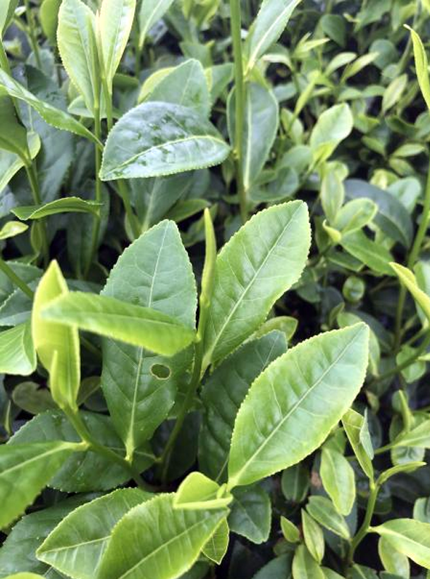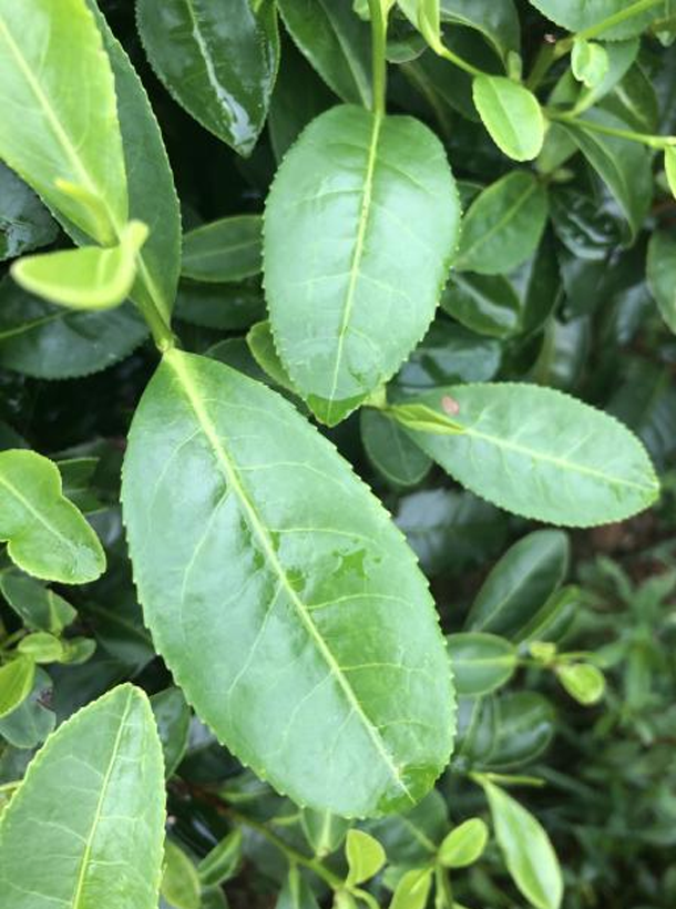 【性狀特征】樹姿半開張,分枝較密。葉片呈半上斜狀著生,橢 服形,葉色綠,有光澤,葉面平展,葉身平,,葉緣平,葉尖漸尖,葉脈11對,鋸齒37對,葉質較厚軟?;ò臧咨?/span>5瓣,尊片5枚,柱頭3裂。產量高,4~6齡茶園僅春季每667m'可產鮮葉1030kg。春季萌發早。2010年和2011年在長沙縣高橋鎮觀測,一芽二葉初展期分別為4月3日和3月27日,分別比福鼎大白茶早1天和6天。芽葉生育力和持嫩性強,淺綠色,茸毛較多,一芽二葉百芽重20.3g。