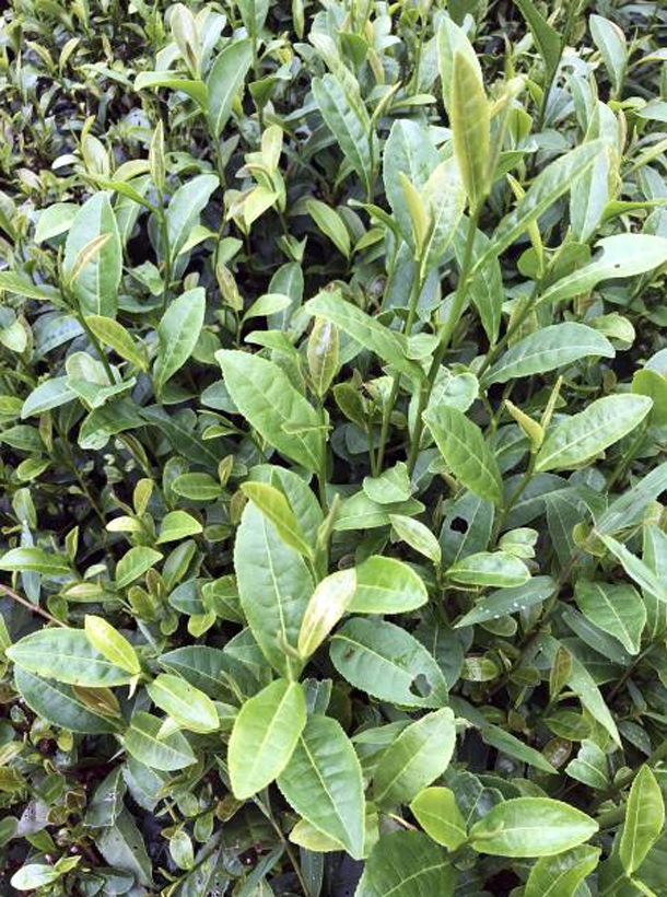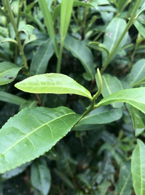 無性系。屬灌木型、中葉類、早生種。植株樹姿半開張,分枝密,葉姿上斜。葉片呈長橢圓形,葉尖較鈍,葉面微隆起,葉色黃綠,富光澤,葉肉較薄,葉質柔軟,側脈明顯,鋸齒較粗、整齊,葉緣微波,芽葉纖細,色黃綠,嫩葉背卷。開花結實率一般。扦插成活率較高。發芽較早,春芽萌發期在3月中旬,一芽三葉盛期在4月中旬;發芽密度大,育芽力強,芽葉纖細,葉色黃綠,葉片薄,葉質軟,茸毛多。一芽三葉百芽重29.7克。